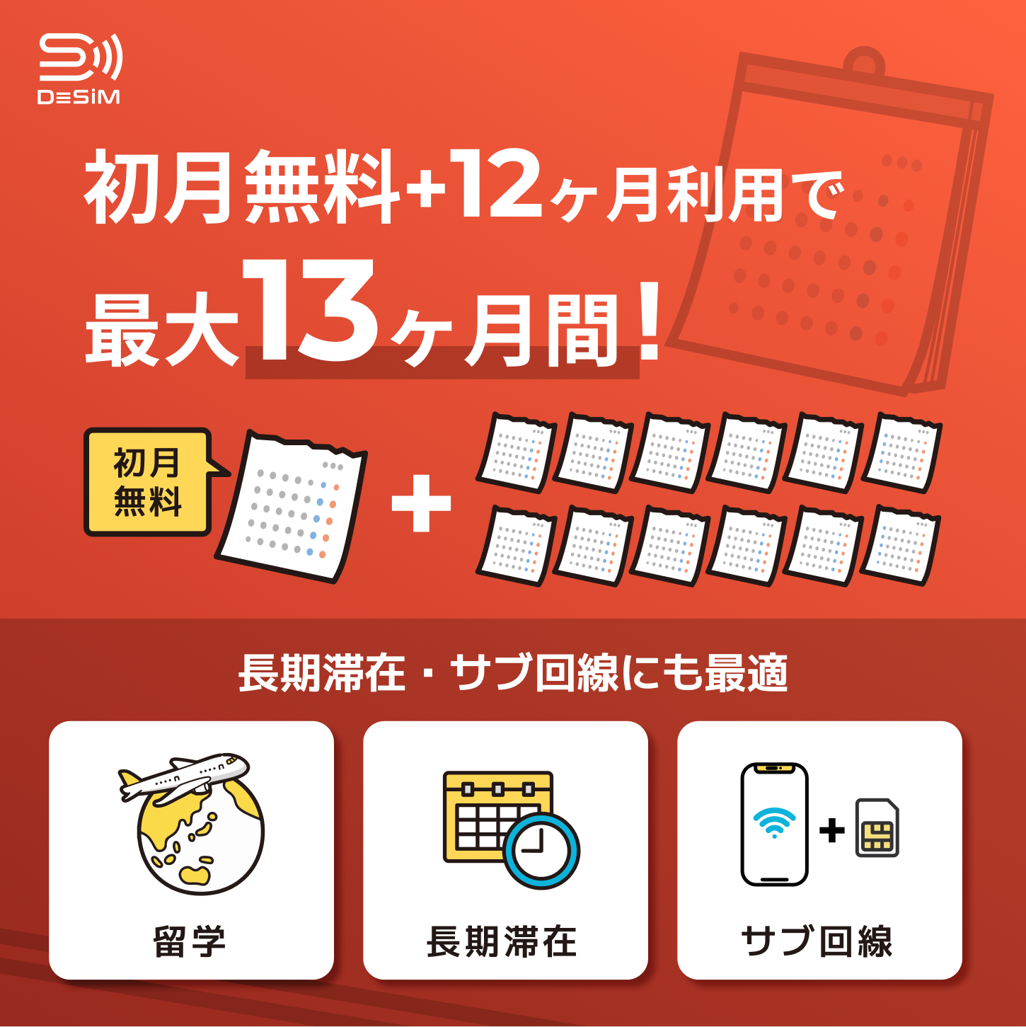 1年間+初月無料で最大13ヶ月間ご利用いただける楽天回線のプリペイド高速データ通信専用SIMカードです。