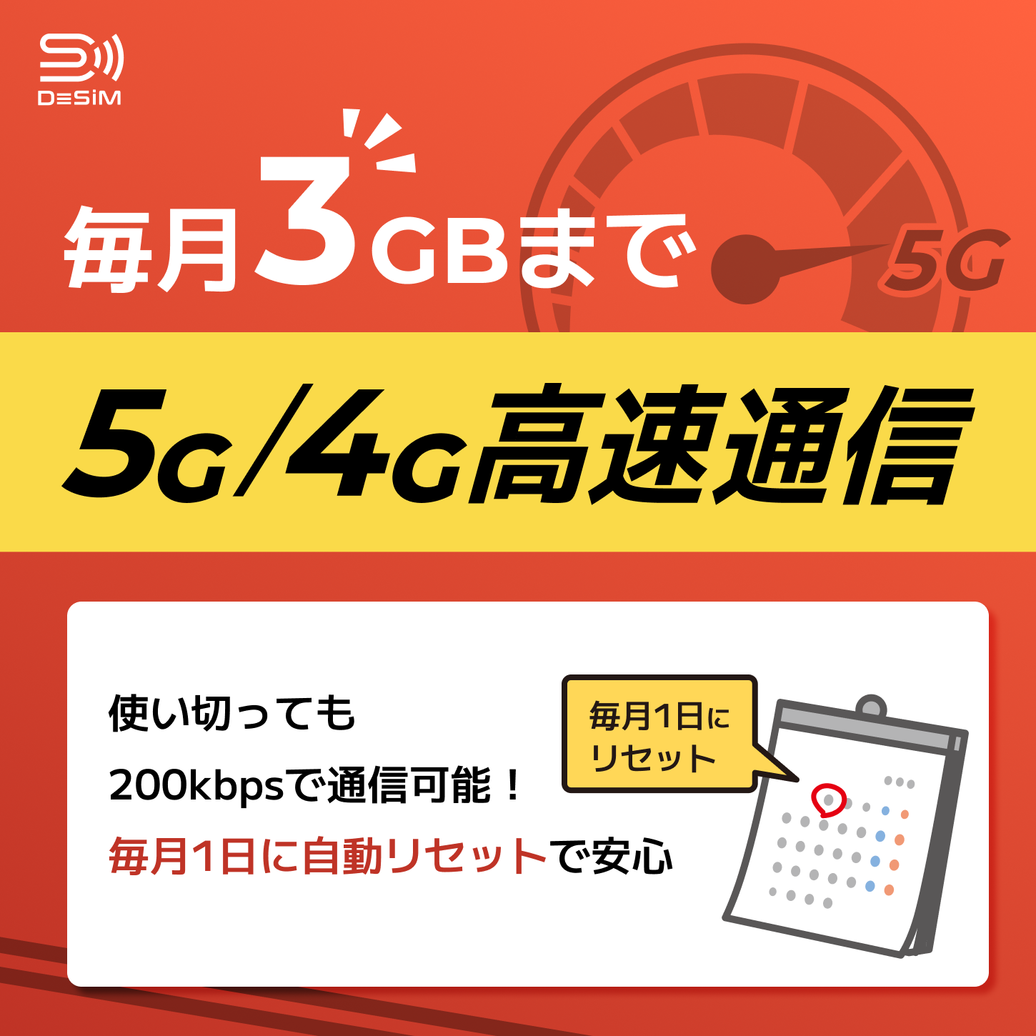 楽天回線エリアでは5G/4G高速データ通信を最大3GB/月までご利用いただけます。3GB/月利用後は通信速度が200kbpsに低速化されますが、毎月1日に通信速度が通常に戻ります。このSIMカードでは音声通話はご利用いただけません。
