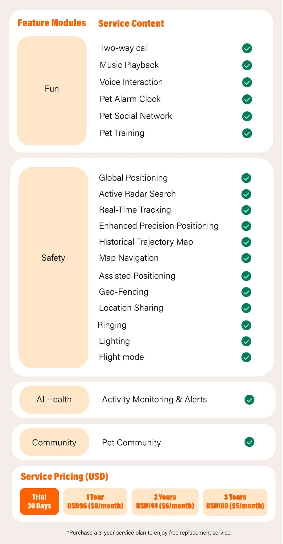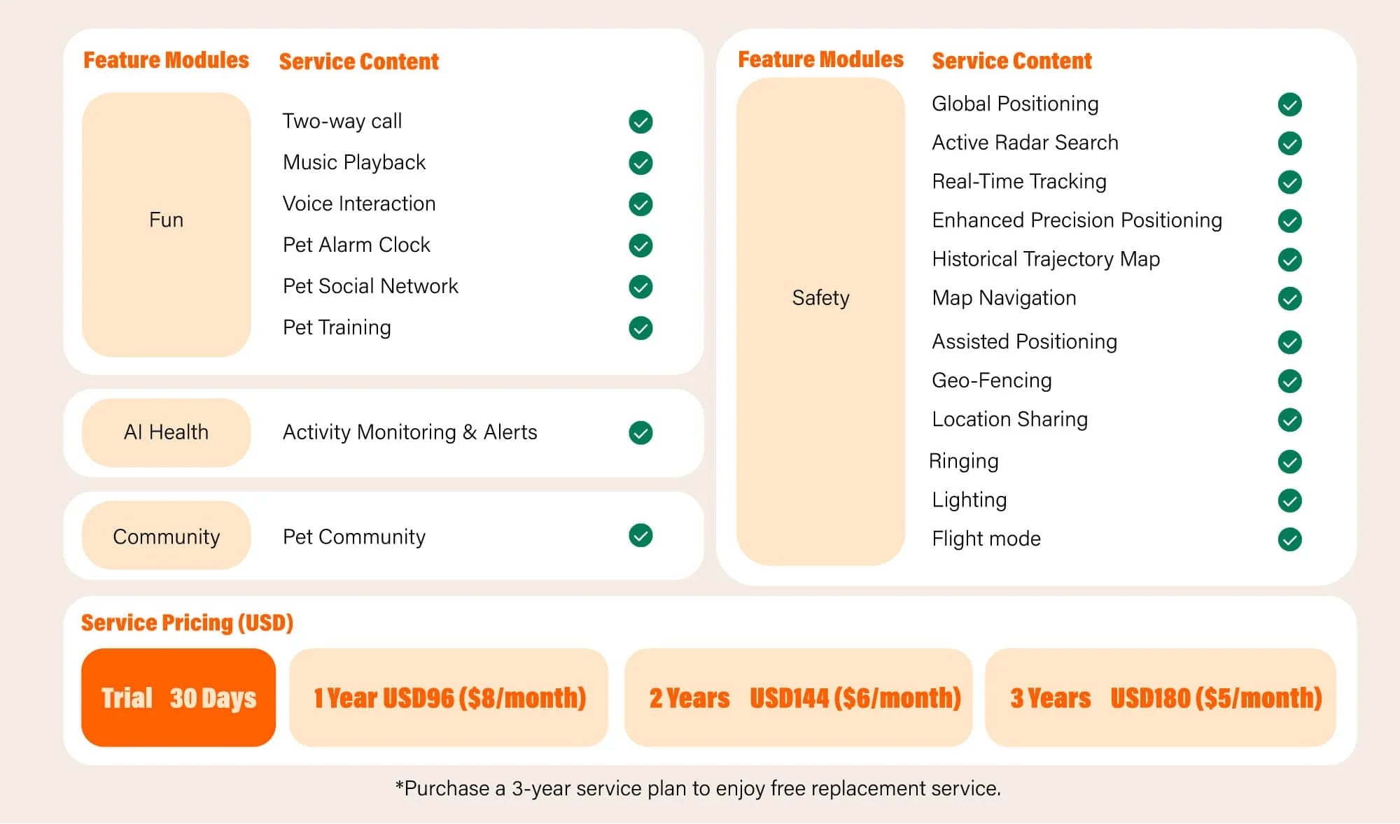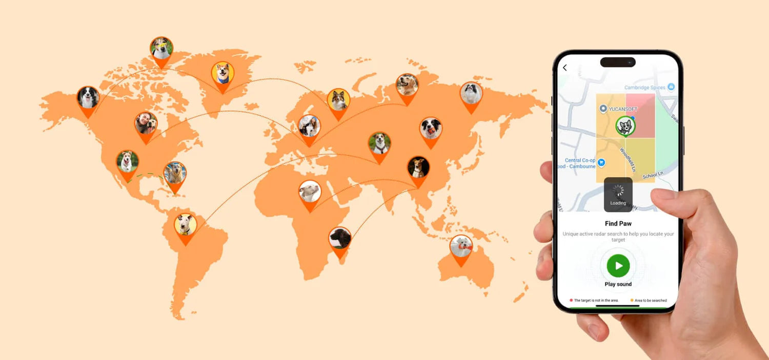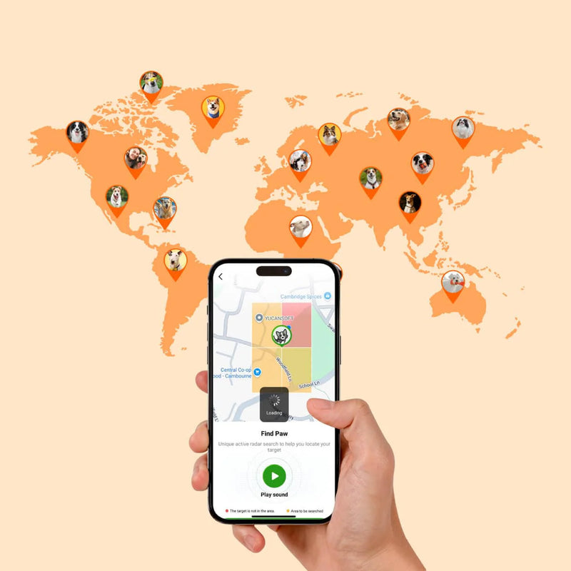 PetPhoneは6つの高度な測位技術を用いて位置を特定します。位置情報はモバイル通信ネットワークを介してバックエンドサーバー(AWSクラウドサービス)に報告され、アプリに表示されます。内蔵のCloudSIMテクノロジーにより、SIMカードなしで200カ国以上、390社の通信事業者の信頼性の高いネットワークを利用できます。